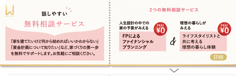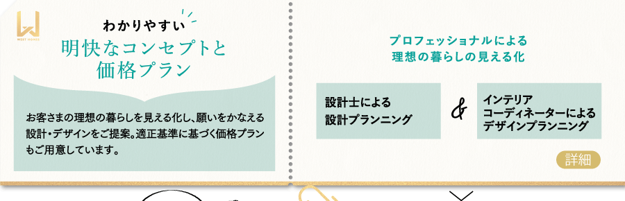 西へ進む太陽が明日に向かっていくように、人生の時間は常に未来に向かっています。だから今より先の暮らしを見つめ、明日に前向きになれる家をつくりたい。ウエストホームズはそう考えています。今日。明日。未来。人生の大切な時間を刻んでゆく家で、どんな自分になりたいか。どんな暮らしを育んでいきたいか。たとえば30年後を思い描いた時、そこに理想の自分はいるか。理想の家を考えることは、自分自身ととことん向き合い、理想の自分や暮らしを考えることに他なりません。お客さまが理想の暮らしを見つけ出すプロセスに寄り添い、心の奥に潜む願いやこだわりを引き出して見える化し、「理想の家」をともに考える。ウエストホームズの家づくりは、そこから始まります。